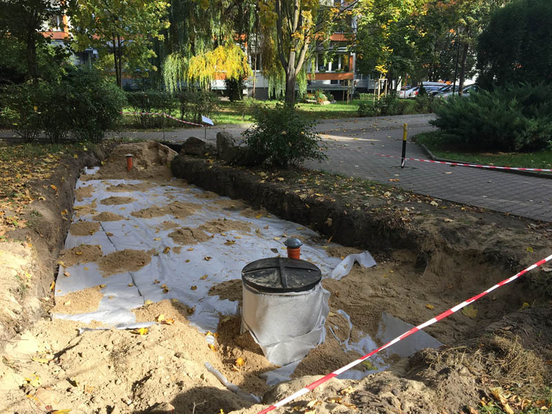 Ogród deszczowy służy do gromadzenia wody deszczowej, którą rozsącza do głębszych warstw gleby. Jak jest zbudowany? Widoczny na powierzchni gruby żwir stanowi wierzchnią warstwę. Pod nim znajduje się cienka warstwa żyznej gleby, a pod nią grubsza warstwa piachu. Kolejna jest gruba warstwa żwiru, w którym zanurzono rurę drenażową. Podłączona jest ona do studni chłonnej, wyposażonej w pakiet rozsączający (zdj. SMLW Popowice).