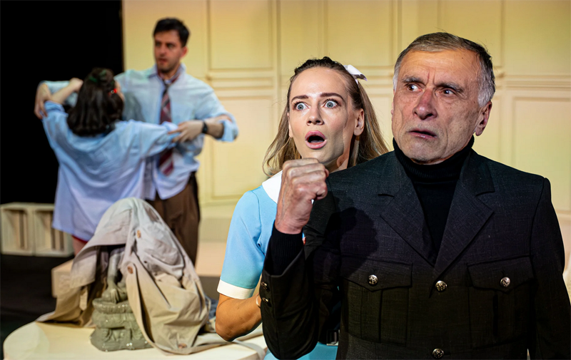 Cały zespól aktorski zasługuje tu na wyrazy uznania: Błażej Michalski – Brindsley Miller gra brawurowo, ale z nerwem i wyczuciem, podobnie jak Beata Śliwińska – Carol Melkett, wpadająca wciąż w przezabawne sytuacje (zdj. Mikołaj Pływacz). Takich ról jest więcej w tym spektaklu, Agata Skowrońska – Panna Furnival, rozbawia publiczność do łez. Jej ewolucje wymagają dużej sprawności fizycznej. Odpowiednio drapieżna i przebiegła jest Marika Klarman-Gisman – Clea. Pozostałe role są także świetnie wycyzelowane. Marian Czerski – Pułkownik Melkett to wojskowy służbista, rozmawiający językiem wojskowych komend. Równie przezabawni są Krzysztof Kuliński – Harold Gorringe, Andrzej Gałła -Schuppanzigh i grający niewielką, ale wyrazistą rolę Marcin Rogoziński – Georg Bamberger.